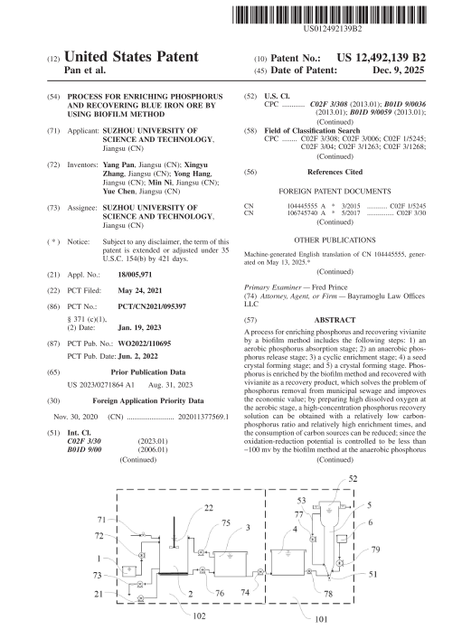 废水低碳处理与资源化团队申请的国际发明专利“PROCESS FOR ENRICHING PHOSPHORUS AND RECOVERING BLUE IRON ORE BY USING BIOFILM METHOD”(生物膜富集磷及回收蓝铁矿的方法)喜获美国发明专利授权(授权号:US12492139B2)。此次获批授权表明成人网