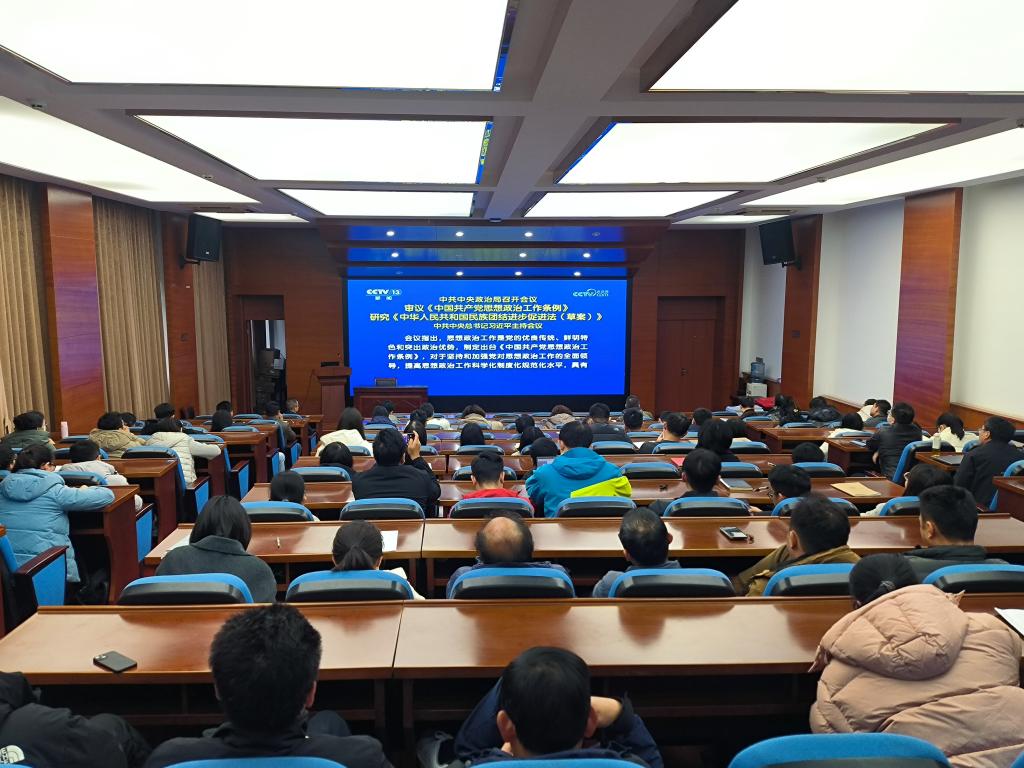 各项工作必须始终坚持正确的政治方向,将思想政治工作贯穿于教学、科研和管理全过程。全体教职工共同学习了《中国共产党思想政治工作条例》,深入了解了《条例》制定的背景意义、主要内容和实践要求。随后,观看了警示教育片《持续发力 纵深推进》第三集《强化正风肃纪》,警示片以案为鉴,展现了形式主义、官僚主义作风带来的严重危害。